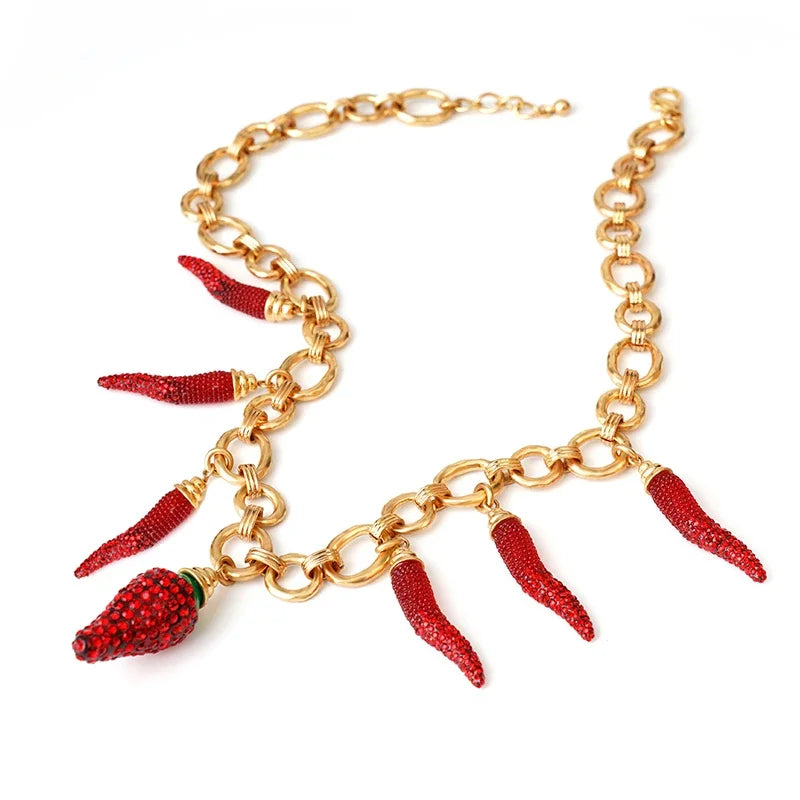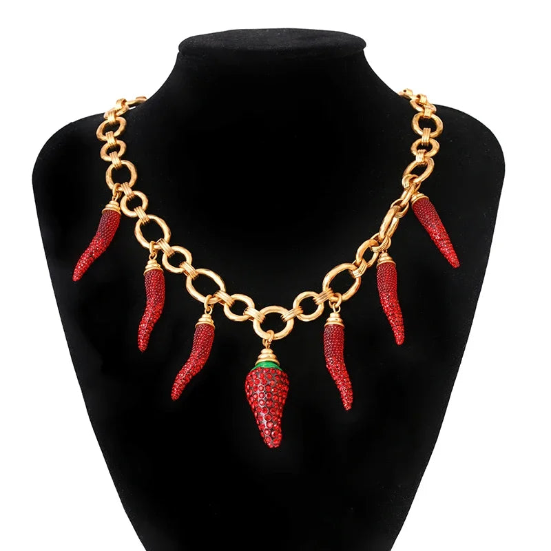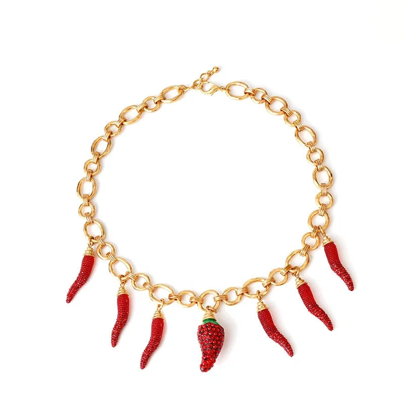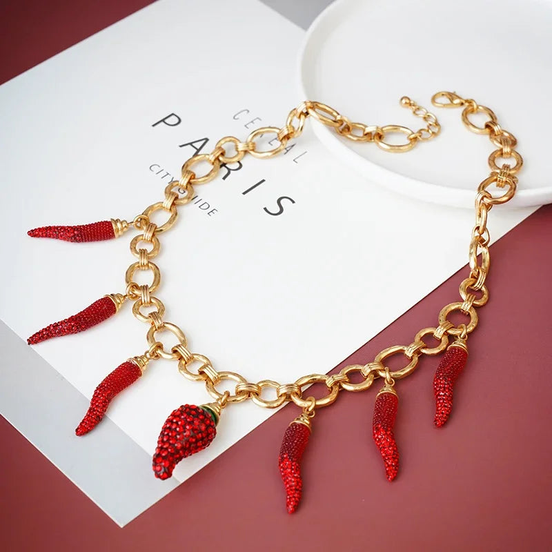 Lassen Sie sich vom luxuriösen Stil der Halskette Queen Rehan verzaubern! Dieses exquisite Schmuckstück begeistert mit niedlichen Cartoon-Frucht-Anhängern, darunter eine leuchtende Erdbeere und ein würziger Chili, die dieser Halskette eine einzigartige und auffällige Note verleihen. Mit ihrem charmanten Design und den lebendigen Farben ist sie das perfekte Geschenk für alle, die mutige und verspielte Mode lieben. Werten Sie jedes Outfit mit dieser wunderschönen Choker-Halskette auf und zeigen Sie Ihre trendige und fröhliche Seite!