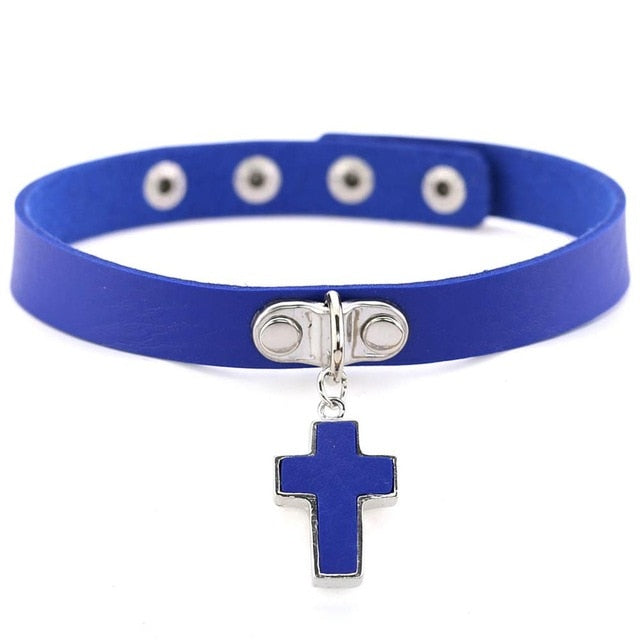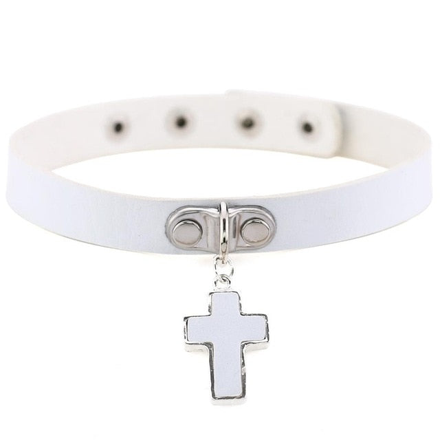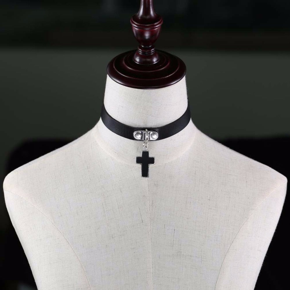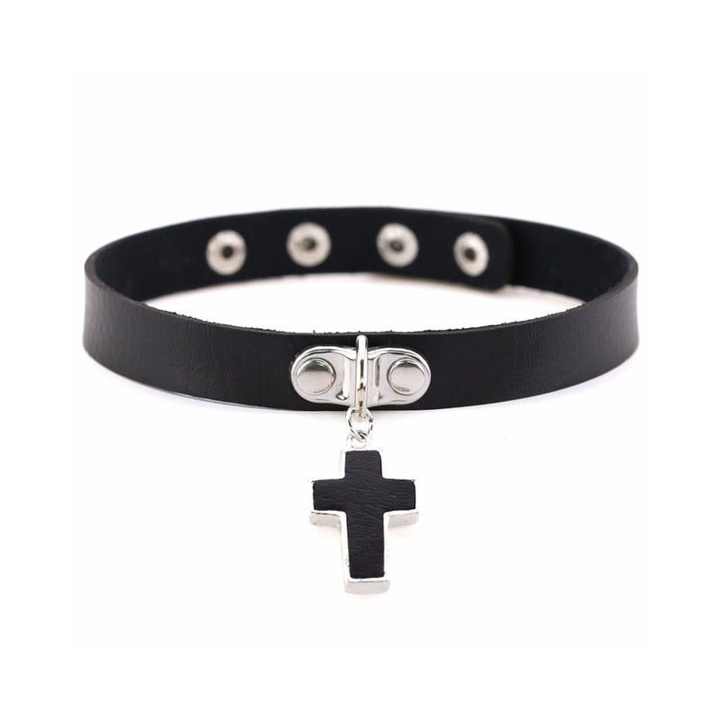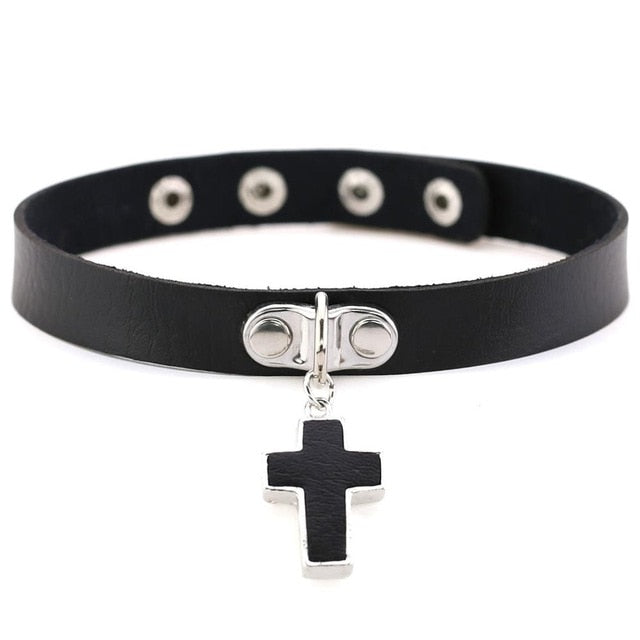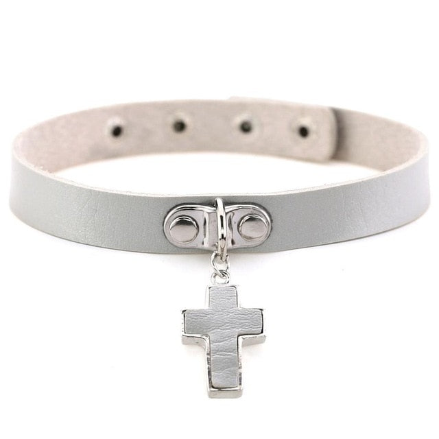 Lederkropfband mit Anhängerkreuz.