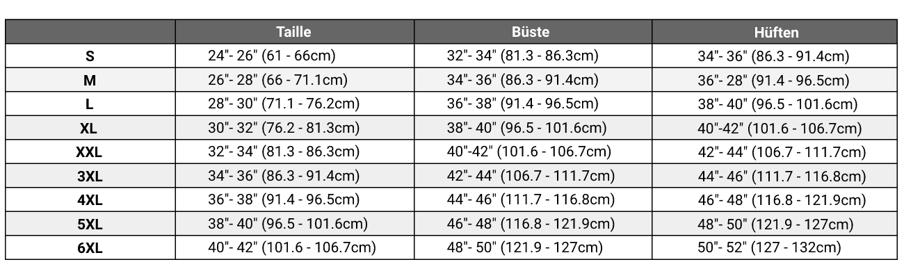 Bitte messen Sie sich selbst und überprüfen Sie die Größentabelle, bevor Sie Ihre Bestellung aufgeben. Wählen Sie die Größe entsprechend Ihrem natürlichen Taillenumfang. Wenn Sie zwischen 2 Größen liegen, wählen Sie bitte die kleinere. Wenn Ihre Oberweite in dieser Größe nicht passt, sollten Sie sich für ein Unterbrustkorsett entscheiden. Die Größentabelle ist genau. Wenn Sie Hilfe bei der Auswahl der richtigen Größe benötigen, geben Sie bitte Ihre Maße an info@thedragqueencloset.de an und wir beraten Sie.