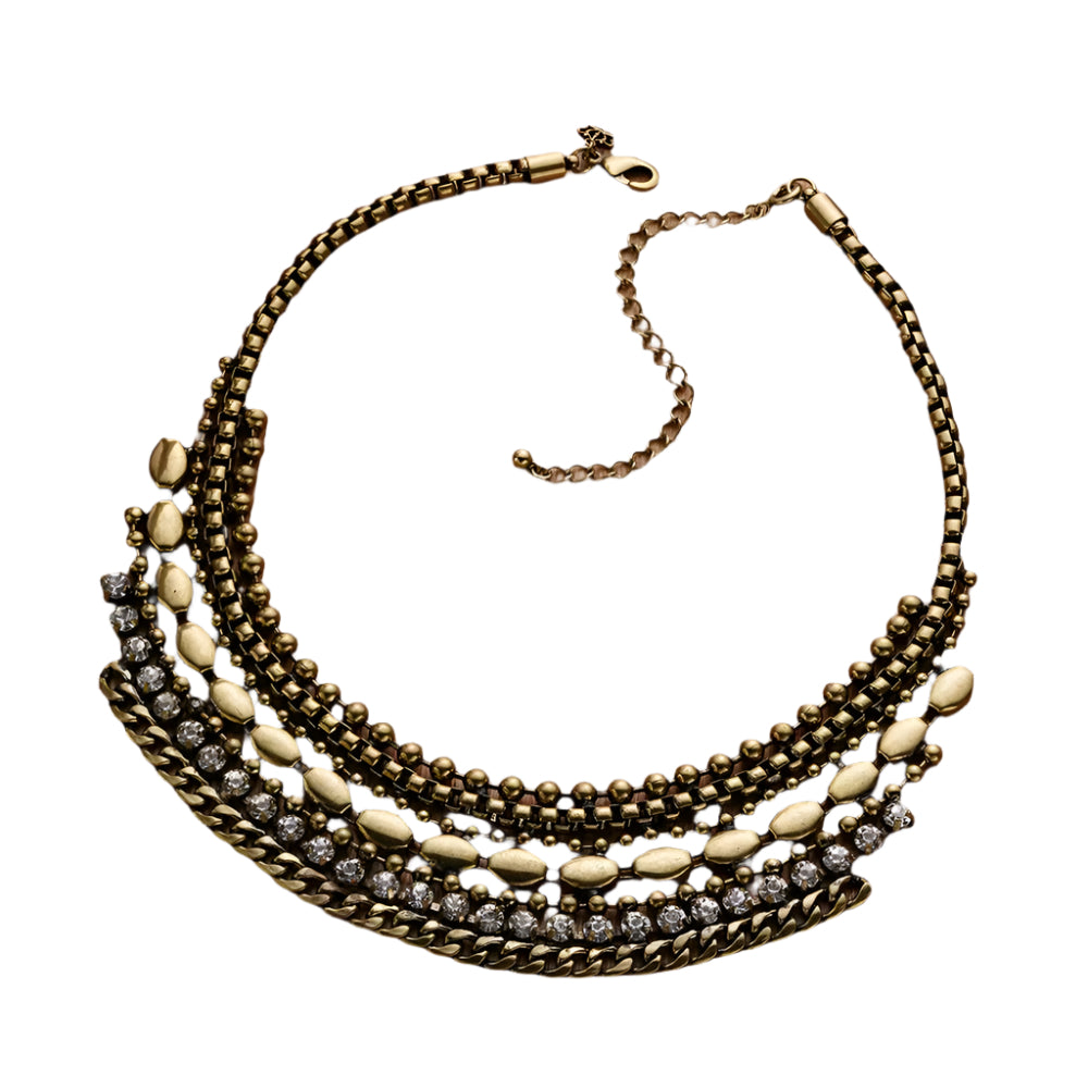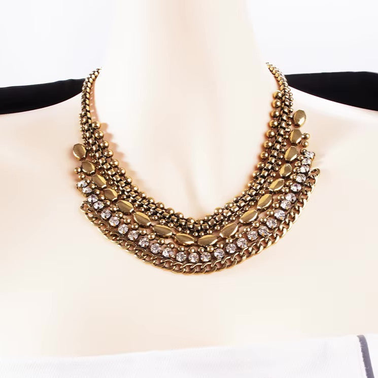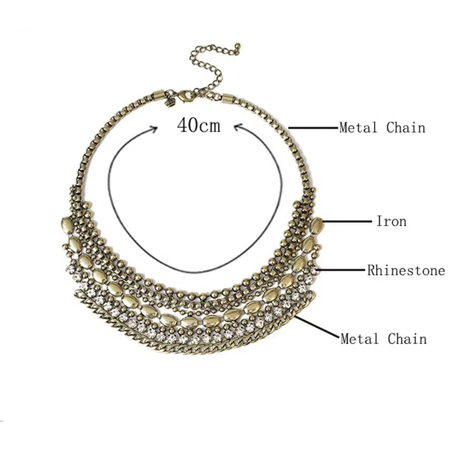 Elegant und raffiniert – diese mehrlagige Metall-Halskette mit Edelsteindetails ist ein echtes Statement-Stück, ideal für alle, die ein Accessoire mit Charakter und Stil suchen. Ihr Design kombiniert verschiedene Kettenarten, goldene Glieder und funkelnde Kristalle, wodurch eine perfekte Balance zwischen klassischer Eleganz und modernem Stil entsteht. Perfekt, um jedes Outfit aufzuwerten – sei es für besondere Anlässe oder um dem Alltag einen Hauch von Luxus zu verleihen.