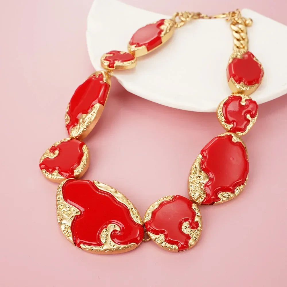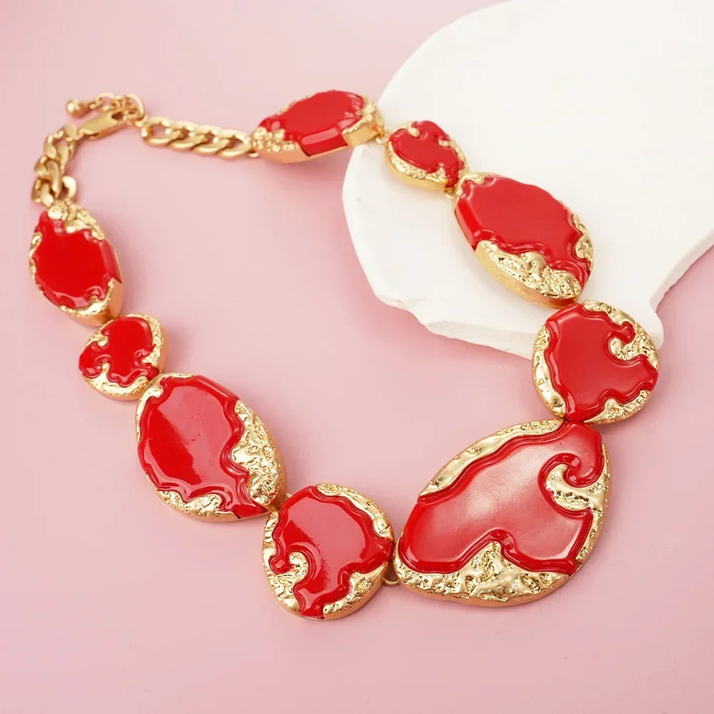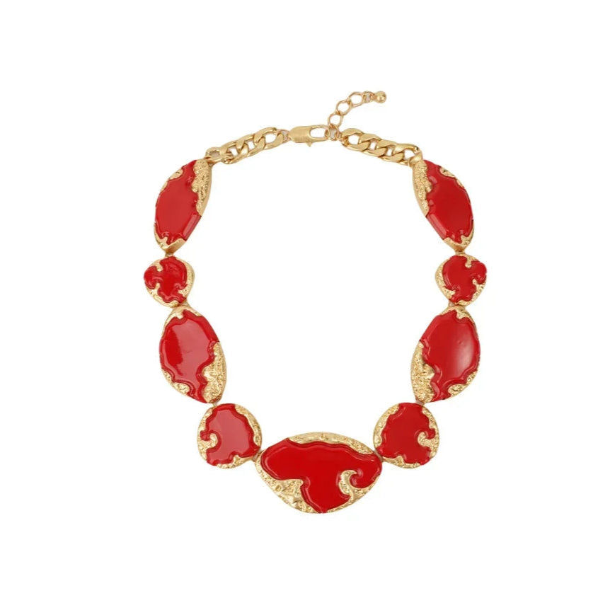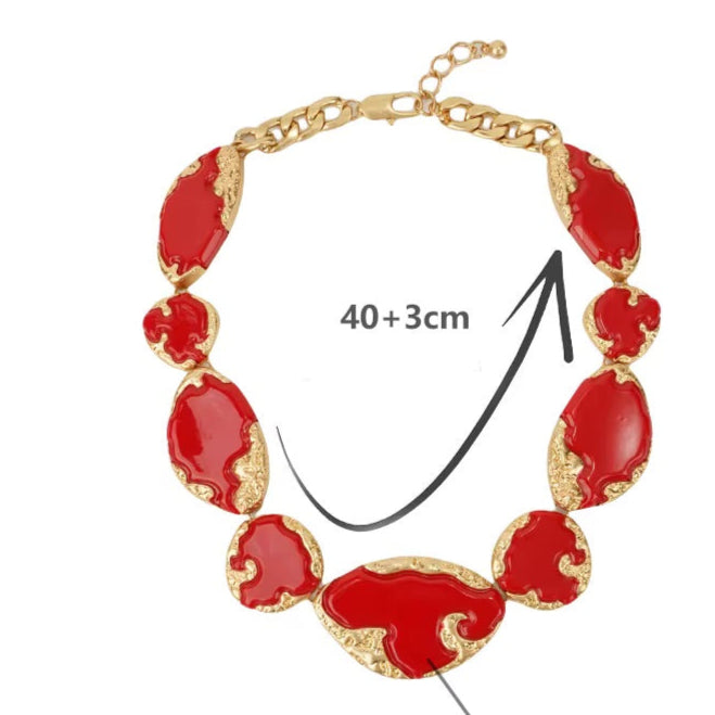 Mutig und anspruchsvoll – diese Statement-Halskette ist das perfekte Schmuckstück, um mit Eleganz aufzufallen. Bestehend aus organisch geformten Gliedern mit leuchtend roter Emaille und vergoldeten Reliefdetails, verkörpert sie einen künstlerischen und raffinierten Stil. Ihre robuste Struktur und der verstellbare Verschluss sorgen für Komfort und eine perfekte Passform. Ideal für alle, die ein auffälliges Accessoire suchen, das Luxus und Modernität für jede Gelegenheit vereint.