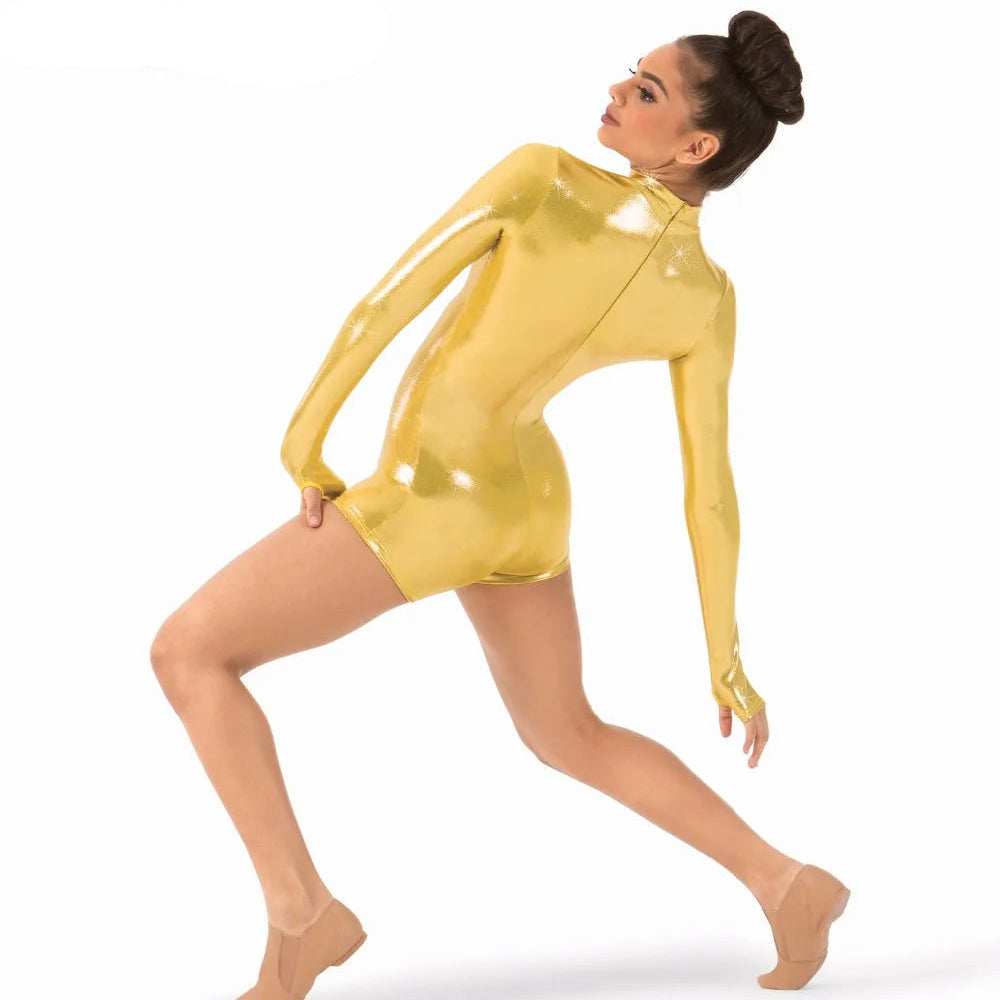 Dieser Turnanzug aus Polyester-Elasthan-Mischgewebe besticht durch seinen metallischen Glanz und die Strickkonstruktion. Er verfügt über einen Stehkragen, lange Ärmel und einen Rückenreißverschluss für sicheren Sitz und Tragekomfort. Ideal für die Kombination von Funktionalität und auffälligem Stil in verschiedenen Farben.